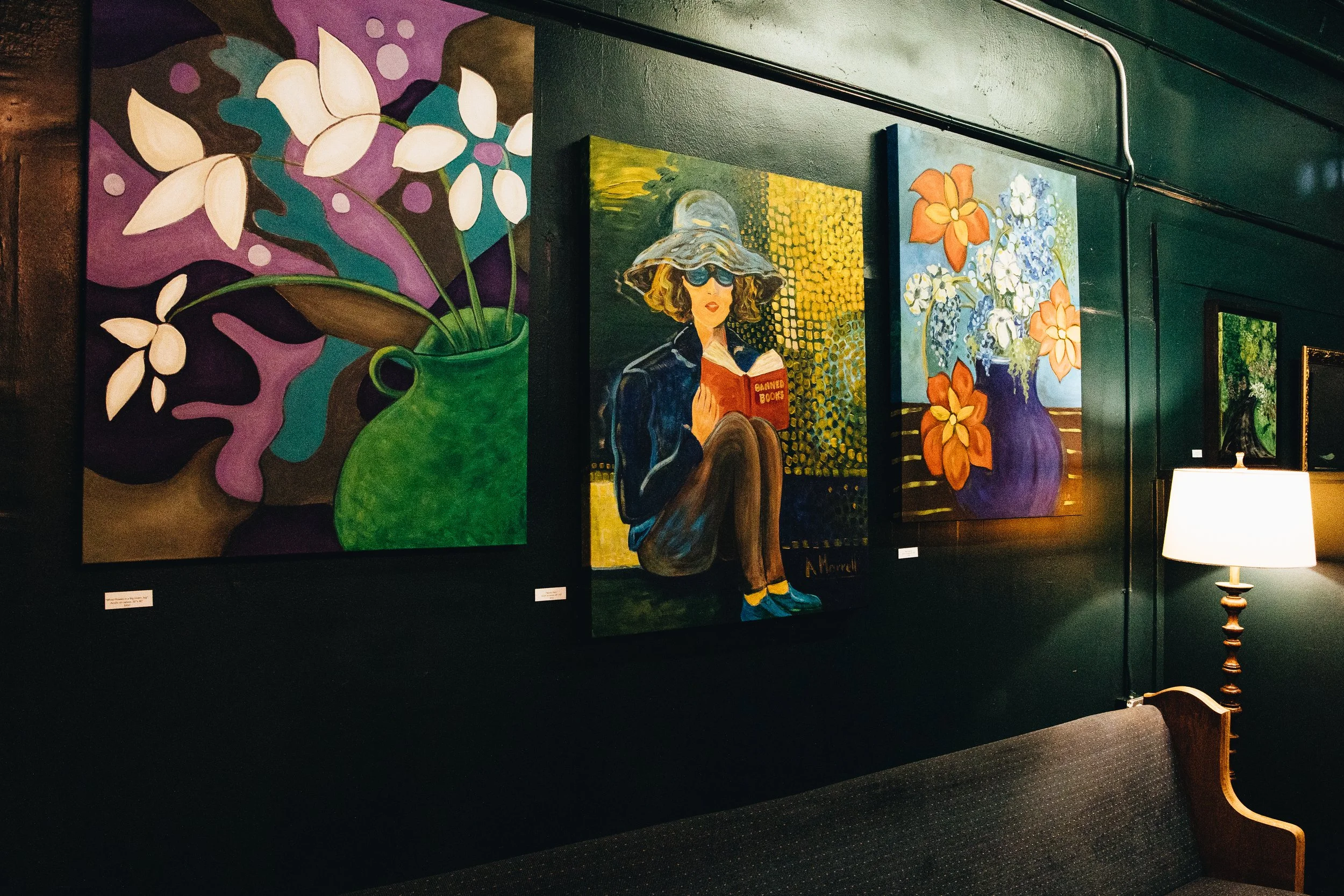 You will be able to see these wonderful colors and artistic elements in the pieces that decorate every wall in Dragonfly - from people reading and landscapes to flowers and dragonflies (of course)! And not only will they add to the shop's vibe, but you can also take her artwork home with you!